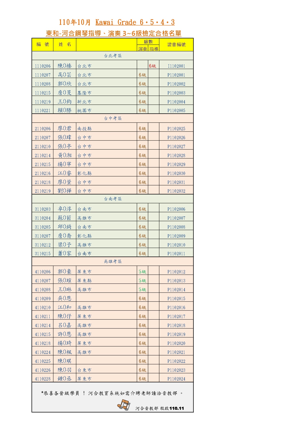 【榜單】2021河合鋼琴指導、演奏級|3-6級合格名單-10月
