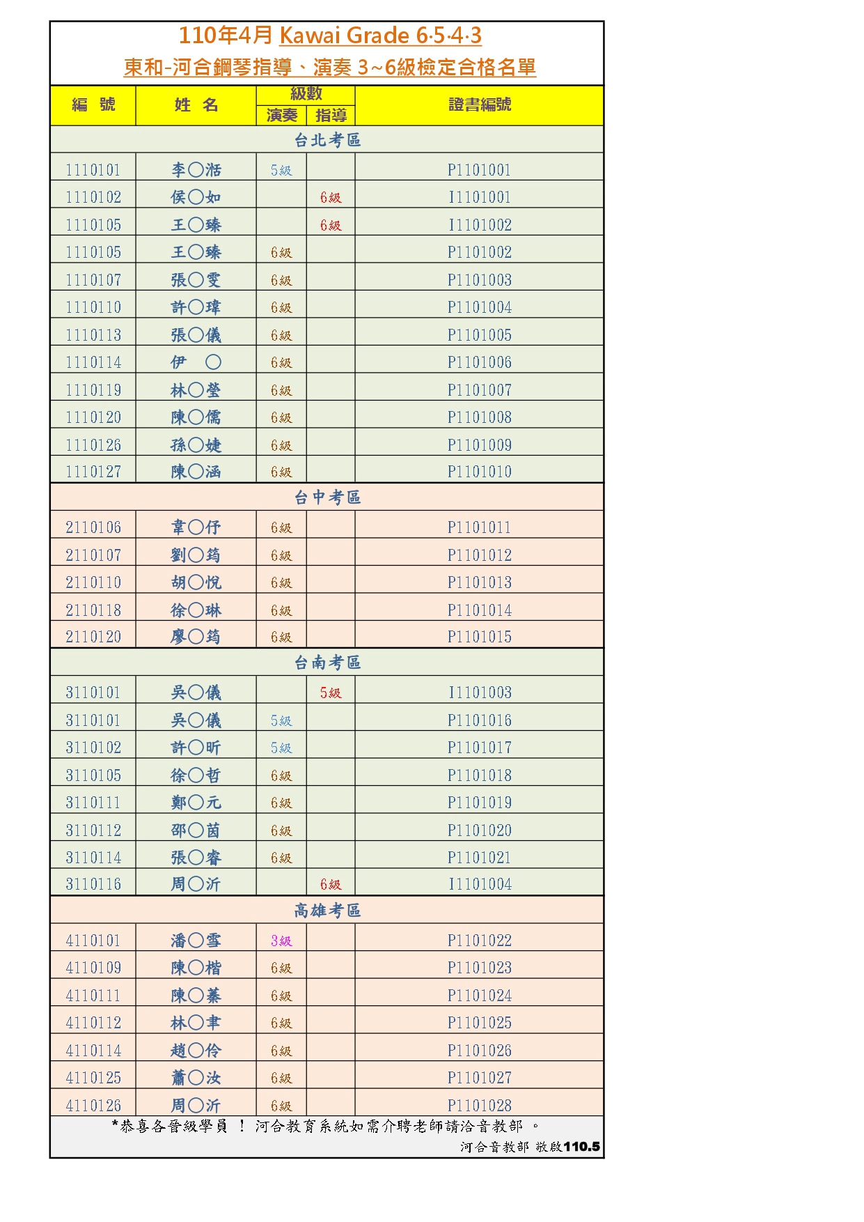 【榜單】2021河合鋼琴指導、演奏級|3-6級合格名單-4月