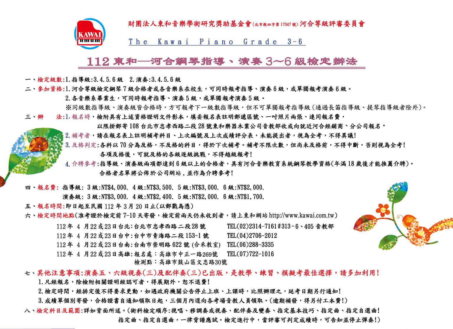 【簡章】2023河合鋼琴指導、演奏級|3-6級檢定辦法-4月