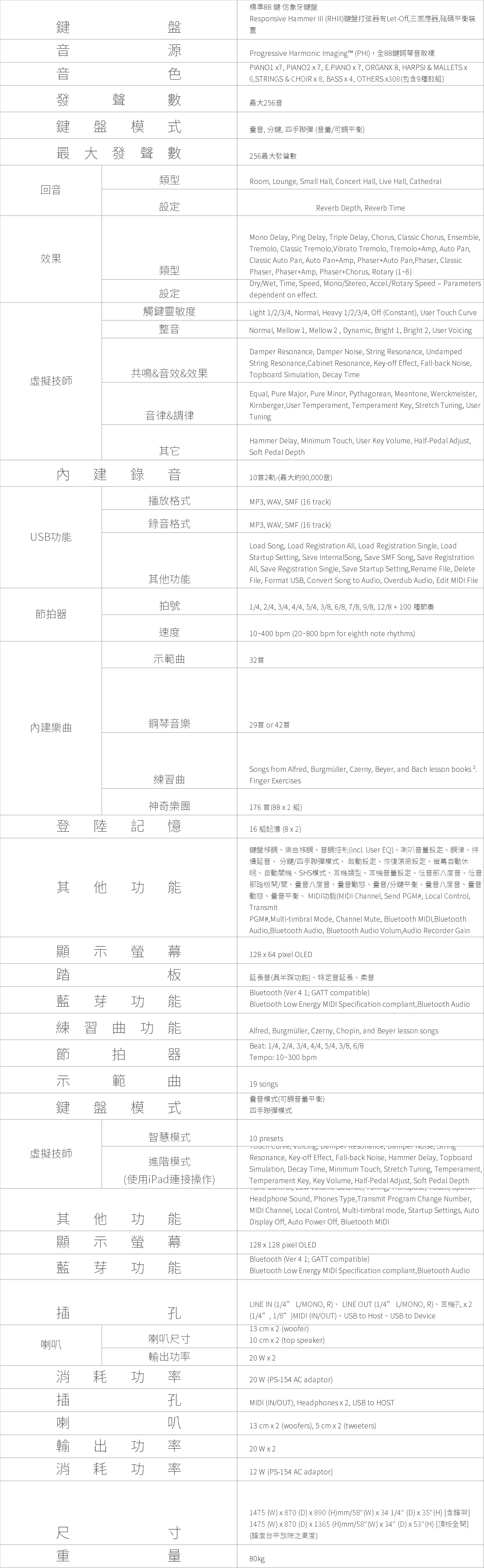 無線藍牙連接、USB音源錄製/播放、四手連彈模式以及