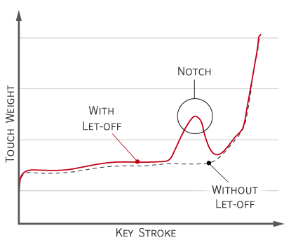 Let-off (小觸鍵)是慢慢按下並放開平型鋼琴特有的鍵盤時的按壓感。 Let-off feel是能夠實現這種細膩按壓感的結構。
