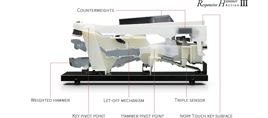 Responsive Hammer Action III 是為了完整重現平型鋼琴觸鍵回饋感,講究鍵盤的質量.音槌的重量感等打弦器細微部分。並搭載了鍵盤砝碼,實現接近木製鍵盤的觸鍵感。鍵盤演奏性和控制性也獲得提升,可以表現出細膩的演奏。