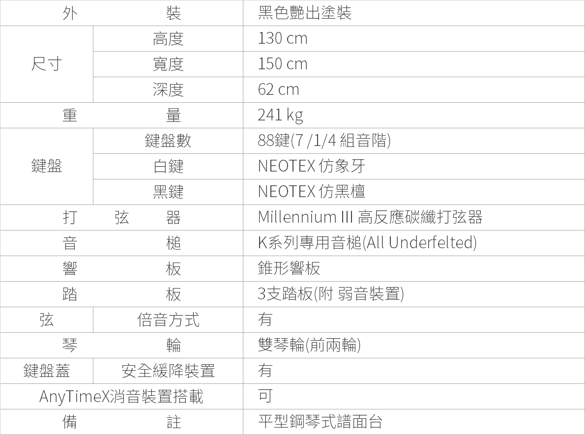 K系列的響板是以科學的數據分析及調律技術人員對聲音敏銳的感知下,所設計每個部位厚度都不同的特殊錐形響板。在兩者完美的融合下產生出精緻細膩的天籟美韻。