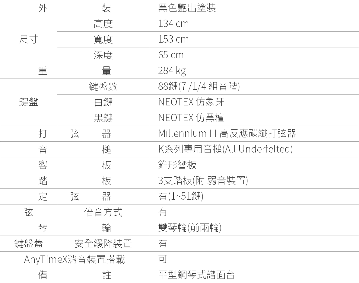 K系列的響板是以科學的數據分析及調律技術人員對聲音敏銳的感知下,所設計每個部位厚度都不同的特殊錐形響板。在兩者完美的融合下產生出精緻細膩的天籟美韻。