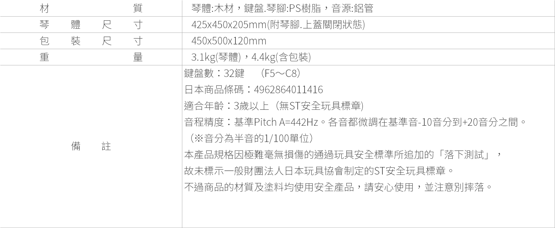 因為是接觸鋼琴的開始,讓您用身體學習記憶正確的音程,並享受演奏樂趣。音程幾乎永久不變。音源是來自鋁管,也是對地球跟耳朵來說最優美自然的純淨聲音。