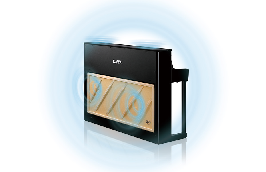 透過在面積寬廣的響板上設置兩種加震器的震動,一般揚聲器很難發出的平行鋼琴莊嚴且悠揚的低音和具深沉感的音響,都透過震動效果忠實重現。