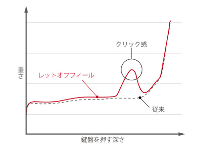 原聲鋼琴來說,慢慢按下琴鍵的話,音槌會在觸碰到琴弦前離開。這個稱為Let-off (小觸鍵),可以感受到獨特的按壓感。Let-off Feel是在電鋼琴上重現原聲鋼琴特有觸鍵感的機制。