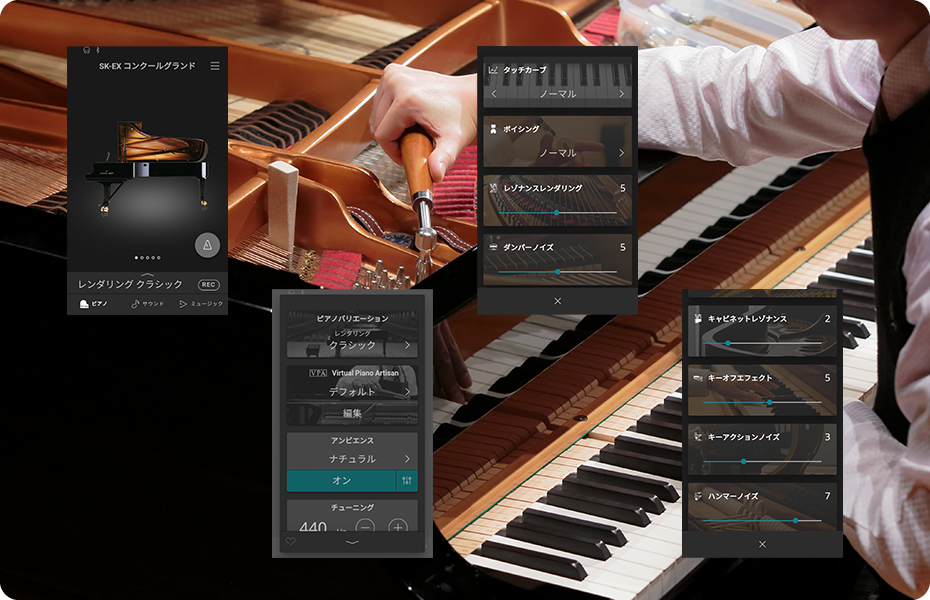 從多台演奏型平型鋼琴SK-EX中挑選出一台,在精心挑選的反響和殘響等音響效果最優異的環境下進行錄音取樣。並由具有國際鋼琴比賽調音豐富經驗,首屈一指的調音師專責調音。