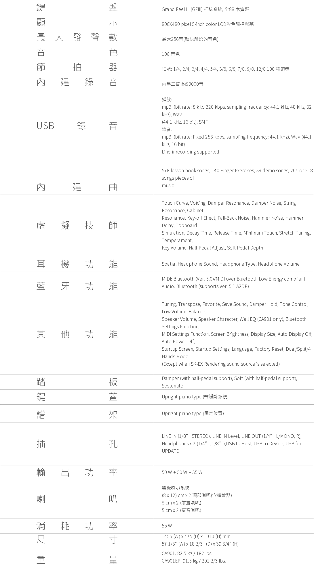 在決定觸鍵關鍵因素的音槌配重,採用將白鍵和黑鍵的音域分類為4個階段的配重。在鍵盤方面,88鍵全都搭載砝碼。透過鍵盤砝碼,實現如平型鋼琴強打時低音域的沉重感,高音域的輕巧感,以及弱打演奏時全部鍵盤細膩的觸鍵感。
