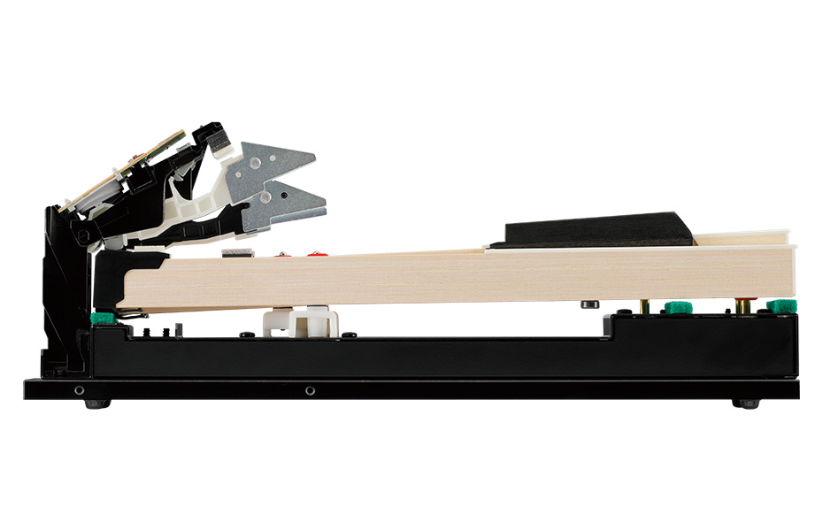KAWAI的木製鍵盤是忠實重現透過按下鍵盤抬高音槌敲擊琴弦的平型鋼琴發聲構造的槓桿結構。並且透過加長從鍵盤到支點距離的設計,發揮卓越的操控性。