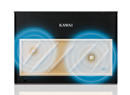 透過在面積寬廣的響板上設置兩種加震器的震動,一般揚聲器很難發出的平行鋼琴莊嚴且悠揚的低音和具深沉感的音響,都透過震動效果忠實重現。