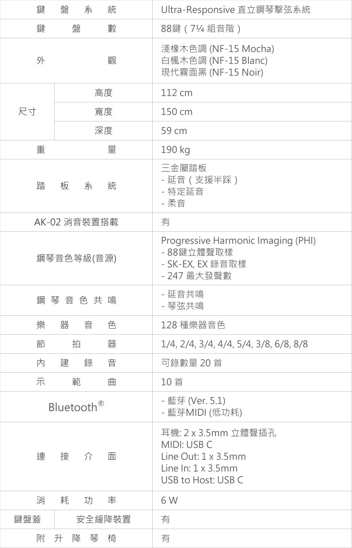 NF15是一部原聲混合鋼琴,當彈奏琴鍵時,內部的琴槌會敲打琴弦,並透過木頭雲杉響板來發出原聲音色,豐富而深沉的音色和自然的共鳴,帶給人愉悅的真實演奏感受。
